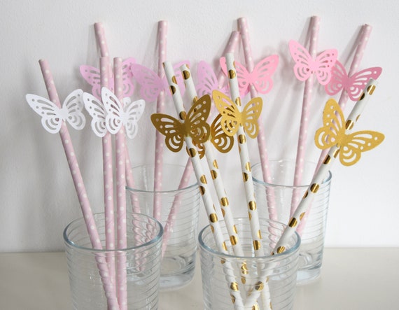 Paper Straws Pink Gold White Butterfly Decoration Table Candy Bar Sweet Table Baptism Birthday Wedding Party